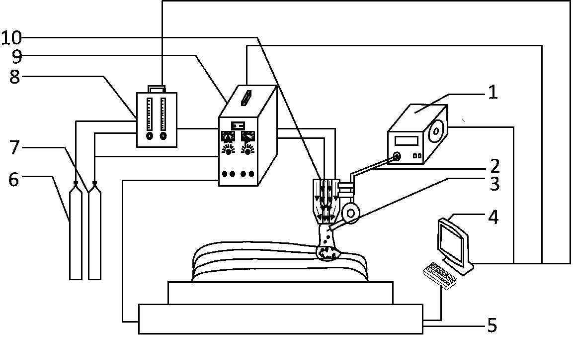 摘要:本实用新型公开一种碳元素原位强化的梯度钛合金等离子弧增材制造装置。在增材制造过程中,送丝机构送入的钛合金焊丝和周围钛合金材料在等离子弧热量作用下呈熔融态,二氧化碳和氩气混合配比的离子气中,反应气体二氧化碳在电弧作用下与熔融态的钛合金原位反应,在待加工钛合金材料上原位生成具有碳化钛增强相的增材试件。调节气体配比器实现不同的二氧化碳氩气配比的离子气,从而得到不同的梯度强化效果。本实用新型在钛合金增材制造的过程中,同时实现对钛合金材料的强化,无需二次强化,减少工艺流程,同时可以通过调节不同的离子气配比实现钛合金材料的可控梯度强化,扩大了高强度钛合金材料的使用范围。