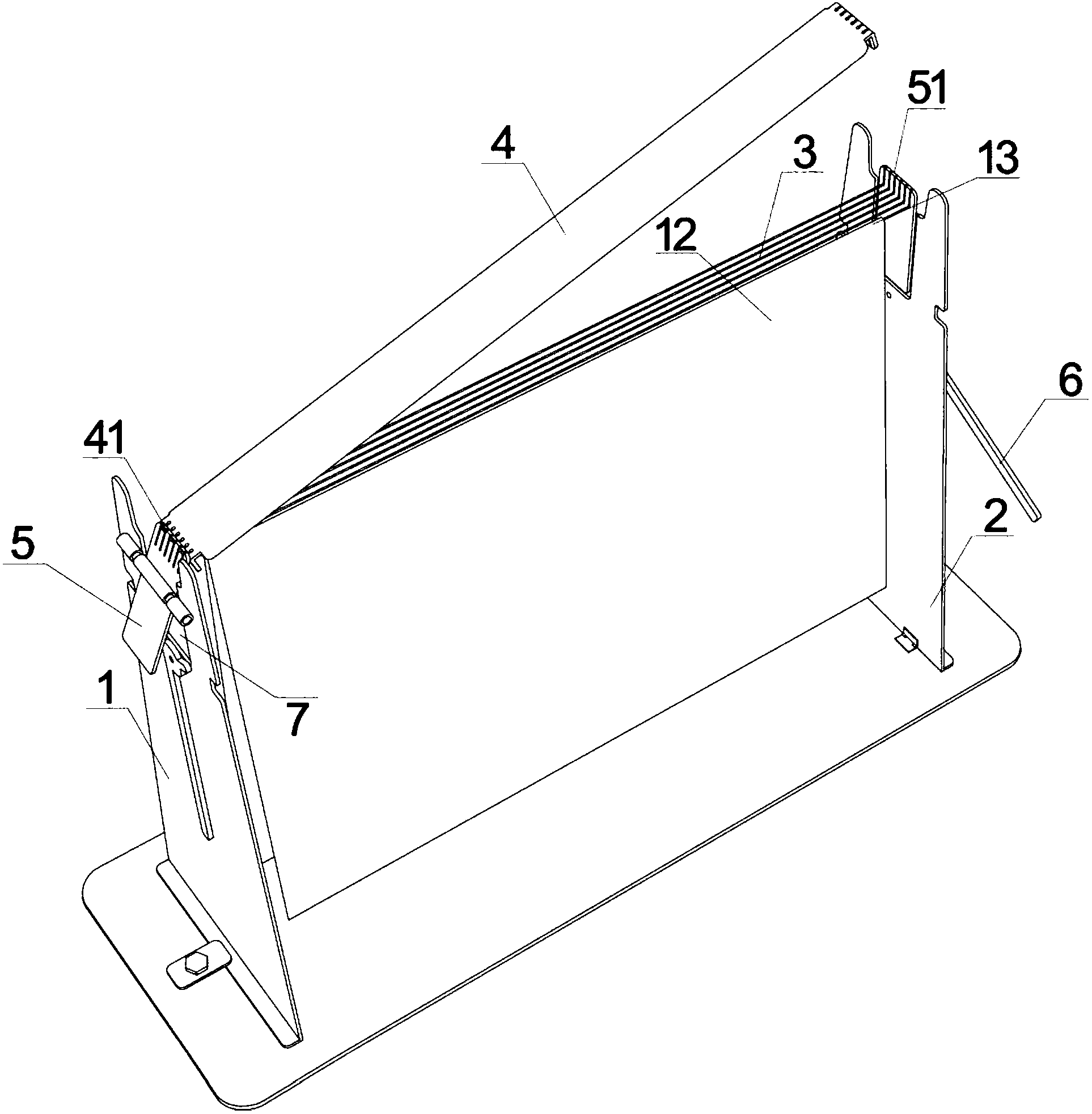 摘要:本实用新型涉及文具用品,主要涉及一种用于装订的装置。一种活页装订装置的安装机构,包括与水平面垂直设置的第一支架和第二支架,在第一支架和第二支架上,对应且均设有:用于支撑拉紧绳,并将拉紧绳导送安装至活页装订装置的装订板上的转动支撑装置,所述装订板两端部设有限位槽,限位槽之间为限位凸起,所述转动支撑装置具有与限位凸起对应设置的导向凸起;在所述的第一支架和第二支架上设有转动支撑装置的止转装置。该机构整体结构简单,安装以及操作方便,装订过程简单快捷,易于生产,造价低廉。
