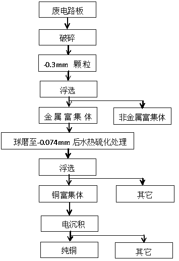 摘要:一种从废电路板中回收纯铜的方法,包括从废电路板中浮选分离铜富集体、通过电沉积法从铜富集体提取纯铜两个步骤:从废电路板中浮选分离铜富集体是将废电路板破碎至0.3mm以下,破碎后的颗粒浮选分离非金属和金属,将浮选分离得到的金属富集体球磨至0.074mm及以下后进行硫化处理,然后从硫化后的金属富集体中浮选分离铜富集体;通过电沉积法从铜富集体提取纯铜是采用离子交换膜隔开的H型电解池,将浮选得到的铜富集体作为沉积原料呈装在电镀用阳极袋中,电解一定时间后从阴极板上回收得到纯铜。