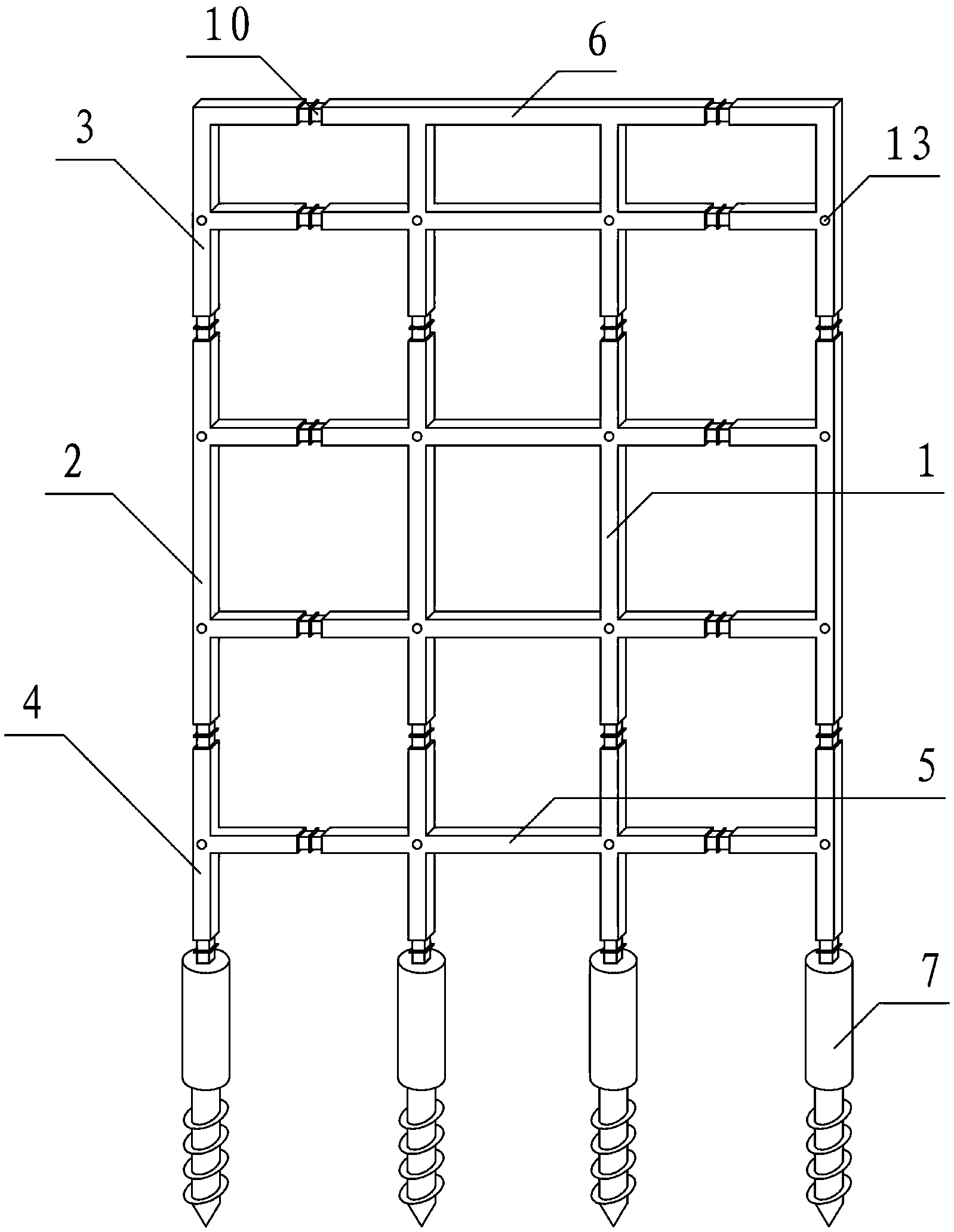 摘要:本发明公开了一种不带挡土板的框架锚杆装配式支护结构及施工方法,该结构包括锚杆、顶部设有钢接头的螺杆桩以及由横梁和立柱构成的框架主体;框架主体由若干框架单元构成,各框架单元横梁端口以及立柱端口处均固定有钢接头,两横梁端口对接处通过钢接头配合螺栓紧固,两立柱端口对接处通过钢接头配合螺栓紧固;所述主体底端框架单元立柱处的钢接头与螺杆桩的钢接头配合螺栓紧固;各框架单元中横梁和立柱的交汇处预留锚杆孔,锚杆锚头穿过锚杆孔,且锚杆锚头顶持在锚杆孔处的框架主体上。本发明简化了施工步骤,并且不受天气的影响,省工省时,节约成本,构件的质量也能得到保证,使工程趋于高效、高质及环保。