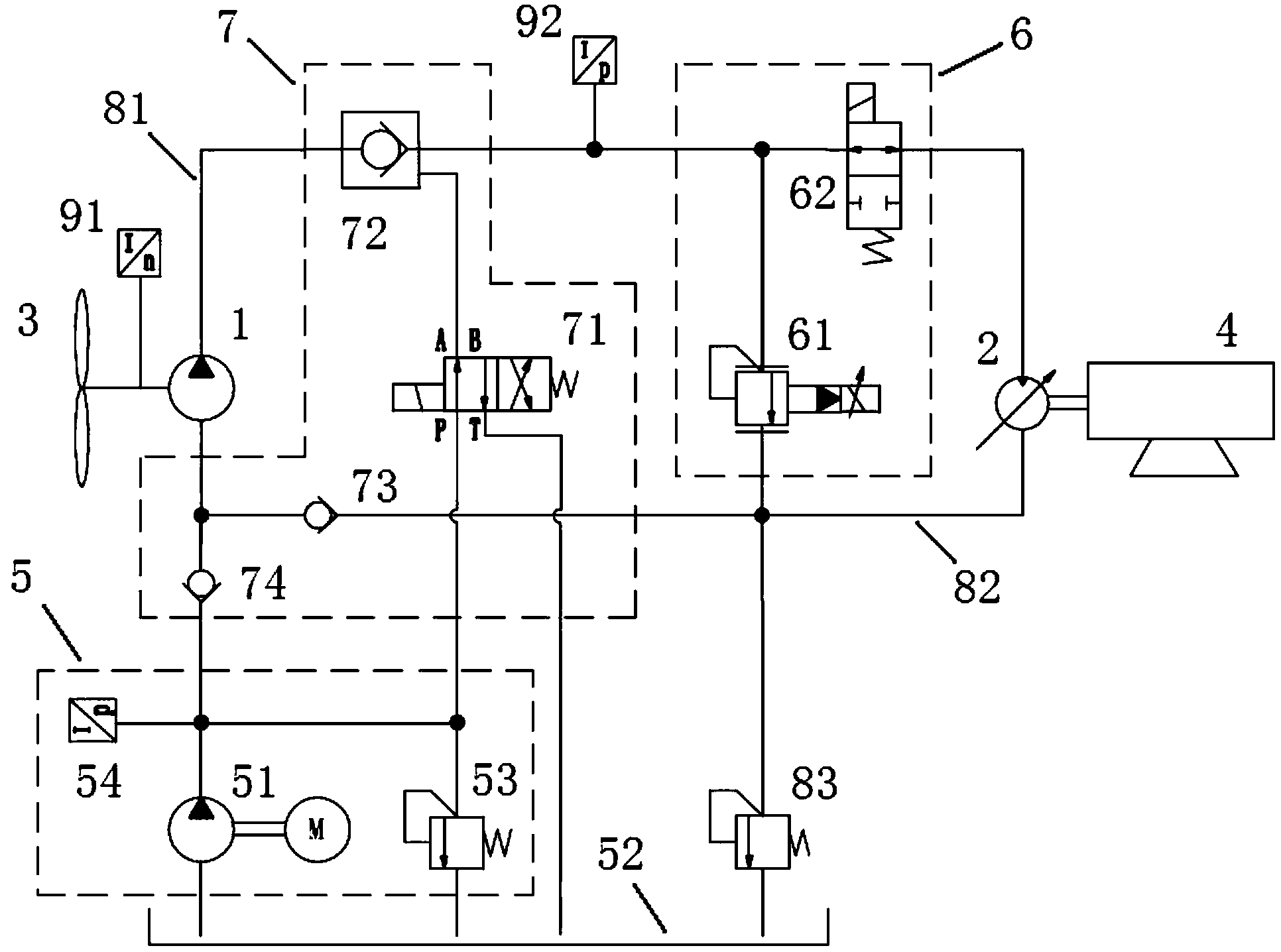 摘要:本发明属于风力发电技术领域。为了解决风力发电机组采用常规机械式刹车时,存在引起机箱震动和刹车盘磨损导致刹车效果下降的问题,本发明公开了一种采用液压缓冲制动和锁紧的风力发电机组。该风力发电机组,包括液压泵、液压马达、风轮、发电机以及补油单元、液压缓冲单元和液压锁紧单元;其中,通过液压缓冲单元可以将正常运行的主循环系统切换至制动循环系统,完成对发电机机组的缓冲制动,通过液压锁紧单元可以对液压泵进行隔离,实现对风轮和液压泵的锁紧。本发明的风力发电机组利用液压缓冲单元和液压锁紧单元,可以实现对发电机组的平稳缓冲制动和锁紧,从而避免发生震动,提高对发电机组的保护,保证刹车效果的稳定。