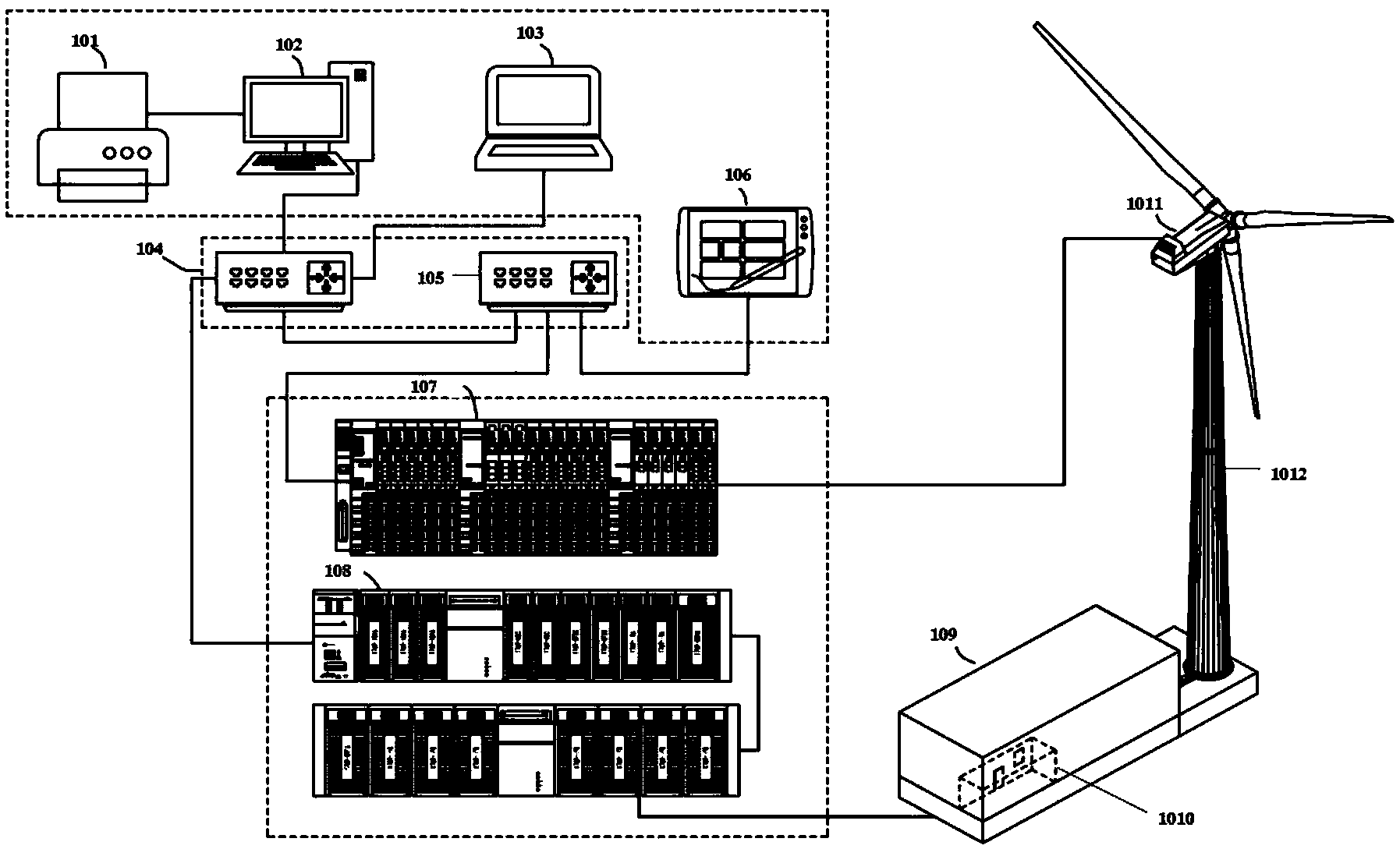 摘要:本发明公开了一种用于静液储能式液压传动型风力发电机组的控制系统,包括位于中控室的工控机、第一网络交换机、主控制器,位于机舱的触摸屏、第二网络交换机、从控制器和机舱控制子系统,马达室控制子系统连接到主控制器,主控制器经由第一网络交换机连接到工控机,机舱控制子系统连接到从控制器后和触摸屏经由第二网络交换机连接第一网络交换机;构成了工控机监控机舱控制子系统和马达室控制子系统和触摸屏监控机舱子控制系统的主从分布系统,通过设置在主控室和机舱的不同控制器协同配合工作,不仅能够对机舱和马达进行及时有效的控制,还能够在两个控制器之间实现通信和信号传递。