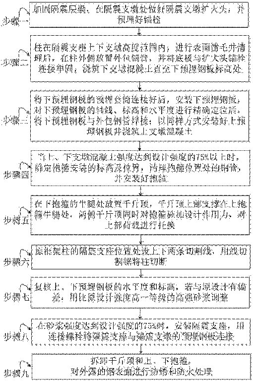 摘要:本发明公开了一种既有框架结构隔震加固的柱的托换方法,在安装隔震支座处的上下框架柱外包钢管,钢管内浇筑混凝土形成钢管混凝土,作为隔震支座的上下支墩,再在上下支墩上安装带牛腿的抱箍,抱箍上放置千斤顶或临时支撑,用于框架柱切割及安装隔震支座时的荷载托换,当隔震支座安装完成后,抱箍拆卸至下一处使用。本发明的既有框架结构隔震加固柱托换方法,使隔震支墩部分的施工大大简化,完成后的隔震支墩又作为托换支撑体系的一部分,而抱箍可拆卸重复使用,施工完成后不影响建筑美观和功能。