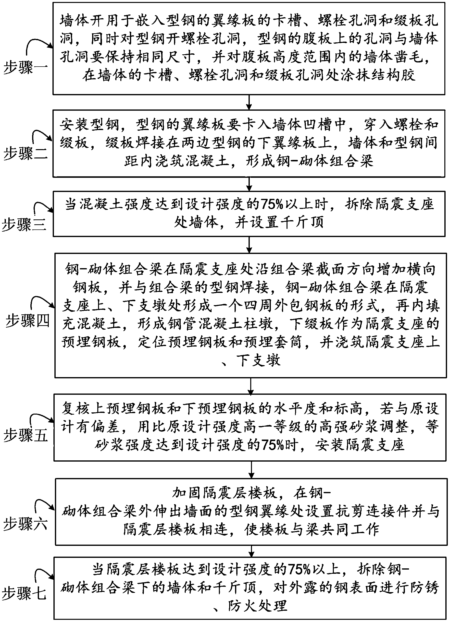 摘要:本发明公开了一种既有砌体结构隔震加固的墙体托换方法,所述的墙体托换方法是在隔震层位置处将型钢翼缘板卡入墙体并填充混凝土,再用螺栓和缀板连接墙体两侧的型钢,使原有墙体、混凝土和型钢形成钢‑砌体组合梁。在隔震支座处,下缀板扩大为隔震支座的预埋钢板,同时沿组合梁截面方向增加横向钢板与组合梁的型钢焊接,形成一个四周外包钢板,内填充混凝土的隔震支墩。此外,在钢‑砌体组合梁外伸出墙面的型钢翼缘处设置抗剪连接件并与新增或加固的隔震层楼板相连。本发明的既有砌体结构隔震加固墙体托换方法,施工工期短,托换构件的截面较小,施工过程中不需要增设临时支撑,施工安全可靠。
