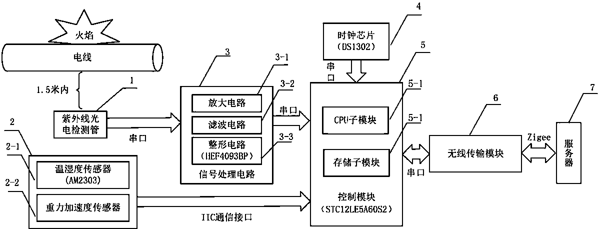 摘要:一种无线多点火焰紫外线检测装置,由紫外线光电检测管(1)、传感模块(2)、信号处理电路(3)、时钟芯片(4)、控制模块(5)、无线传输模块(6)和服务器(7)组成,紫外线光电检测管(1)检测紫外线信号并将检测数据送到信号处理电路(3);传感模块(2)采集设定区域内的温湿度和重力加速度数据,连接到控制模块(5);信号处理电路(3)对紫外线光电检测管(1)采集的数据进行处理;所述时钟芯片(4),用于提供时钟、时间信息;控制模块(5)用于系统控制和信息存储;无线传输模块(6),采用Zigbee协议,用于和服务器(7)之间完成信号的收发;服务器(7),用来接收多个检测装置收集的信息并完成相关存储和处理任务。