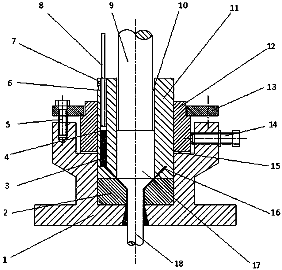 摘要:一种热挤压装置的自润滑结构,挤压凹模(2)通过过盈配合固定在挤压模座(1)上,挤压衬套(11)的前端与挤压模座(1)也是过盈配合,它的后端由衬套固定套(12)固定,而衬套固定套(12)由固定螺钉(14)固定和调节;衬套固定套(12)通过垫圈(15)与挤压模座(1)接触,由固定板(13)通过螺栓(5)固定在挤压模座(1)上;在挤压衬套(11)靠近挤压凹模(2)的一端开设环形槽(16)和一个矩形的熔融玻璃粉压室(7),在靠近熔融玻璃粉压室(7)的末端开设一个熔融玻璃粉进孔(6),活塞杆(8)能够在熔融玻璃粉压室(7)里自由活动,活塞杆(8)的前端带有活塞密封垫(4);在挤压腔(10)的里装有胚料(17),挤压推杆(9)能够在挤压腔(10)内自由活动。