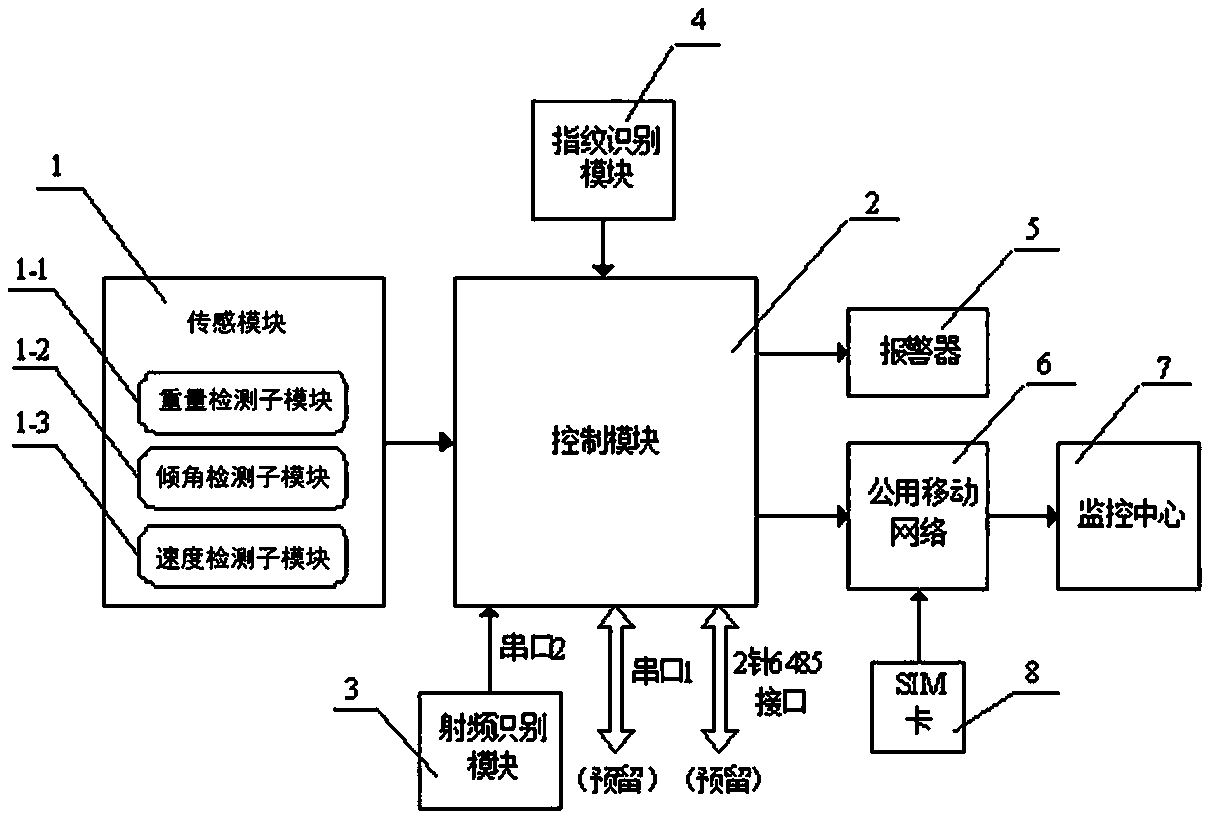 摘要:一种基于物联网技术的升降机监控系统,包括传感模块(1)、控制模块(2)、射频识别模块(3)、指纹识别模块(4)、报警器(5)、移动公用网络(6)、和监控中心(7)、SIM卡(8),其中传感模块(1)、射频识别模块(3)和指纹识别模块(4)分别连接到控制模块(2),使其能够被控制;控制模块(2)通过SIM卡(8)接入公用移动网络(6)与监控中心(7)建立通讯,使检测数据能够上传到监控中心(7)并做相应处理。