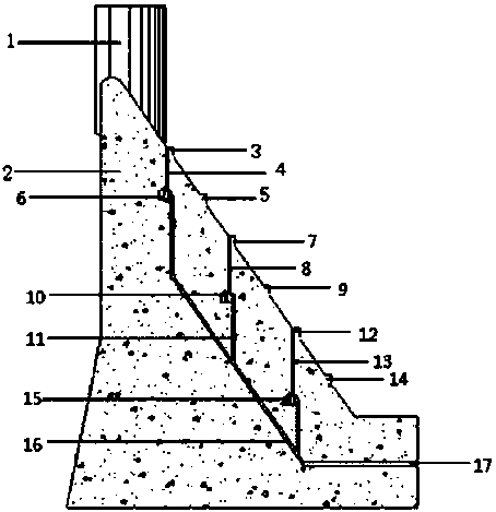 摘要:溢流坝上的机械杠杆式压力发电系统,一级台阶(3)、一级集水发电井(4)、一级发电廊道(8)、排水管(16)依次相连;三级台阶(7)、三级集水发电井(8)、三级发电廊道(10)、排水管(16)依次相连;排水管(16)、冲於口(17)依次相连;一级发电廊道(6)包括有大水斗、小水斗、混凝土重力支墩(20)、混凝土支墩座(23)、轴承(21)、铰链二连杆(30)、组合式齿轮单向加速装置(25)、发电机(36);混凝土重力支墩(20)通过轴承(21)、铰链二连杆(30)分别与混凝土支墩座(23)、单向加速装置(24)相连,水斗分布为:中间的单向加速装置(24)连接大水斗,两边分别连接小水斗。