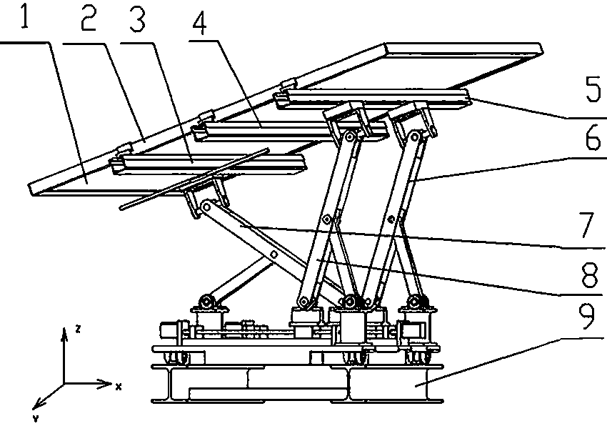 摘要:一种并联型太阳能跟踪装置,支链(6)、支链(8)上端分别通过支链U形件(21、11)与太阳能光伏板框架(2)固接,支链十字轴(22、12)一端分别与支链U形件(21、11)铰接,另一端与支链杆件(6‑a)、支链杆件(8‑a)铰接;支链杆件(6‑a、8‑a)分别在中心处与支链杆件(6‑b)、支链杆件(8‑b)上端铰接,在下端分别与支链座滑块(25)、支链座滑块(16)铰接,支链座滑块(25)、支链座滑块(16)分别与丝杠(24、17)滑动连接;支链杆件(6‑b、8‑b)下端分别与支链垫块(23)、支链垫块(14)铰接,支链座(29)、支链座(15)下端通过轴承座(19)铰接到下平台底座(9)上。