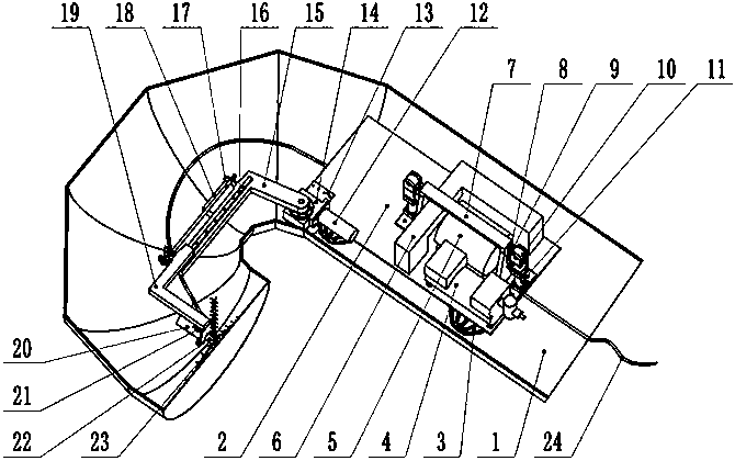 摘要:一种用于虾米弯清理的可自动回转机器人,由行走小车、恒力顶紧机构、回转机构和清扫机构组成,所述的行走小车安装四个半球形的轮子,由电机配蜗杆减速器驱动行走,车架上集成有气泵、液压泵及液压油箱等,所述的恒力顶紧机构通过气缸推动张紧轮,所述的回转机构由电机驱动蜗杆减速器,从而带动L型回转臂转动,刷体梁可以在回转臂上移动,两者协同动作,保证刷体始终沿虾米弯轴线移动,所述的刷体由若干小刷组成,每根小刷由细铁丝扎制于一根粗钢丝上形成,所述的吸尘管固定在刷体正下方,实现实时吸尘,保证清扫效果,工作完之后,L型回转臂可以收到车体内部,使刷体处于车体正前方。