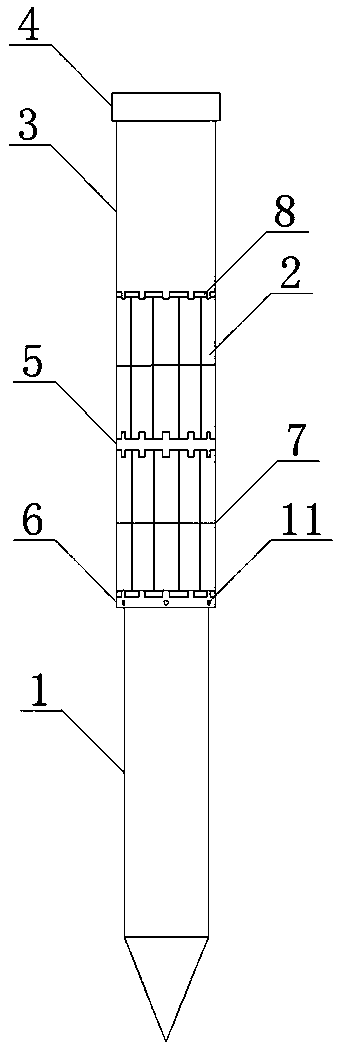 摘要:一种消除桩基负摩阻力的扩体挤密桩及施工方法,属于岩土工程地基处理领域,其结构包括桩体、扩张装置、套筒和承台;桩体为混凝土钢管桩;扩张装置由双向卡箍、单向卡箍、曲柄连杆、转轴销连接构成,利用转轴销将曲柄连杆连接在双向卡箍两侧的转轴支座上,将双向卡箍一侧的曲柄连杆与单向卡箍相连,形成扩张装置;套筒为一圆柱形钢筒,与扩张装置自由一侧的曲柄连杆相连;将连接好的装置套入桩体,使套筒顶部与桩顶齐平,并用定位螺栓固定单向卡箍;用打桩机将桩体打至设计位置;在桩顶浇筑钢筋混凝土承台。本发明各配件之间拼装简单,实用性强,施工方便,安全环保,特别适用于湿陷性黄土地区和软土地区的地基处理。