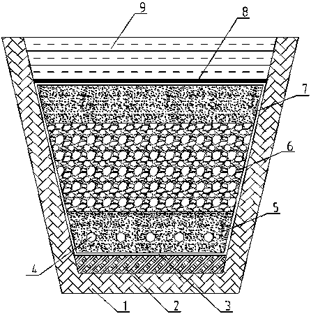 摘要:一种高填方地基排水盲沟,包括纵向排水盲沟(10)和横向排水盲沟(11),纵横向排水盲沟相互交错呈井字形分布,组成排水盲沟网,排水盲沟结构由素填土层(2)、土工布(3)、软式透水管(4)、第一细砾石层(5)、粗砾石层(6)、第二细砾石层(7)、土工格栅(8)组成;从地基表层的泉眼(12)处开始沿水流方向(13)设置具有喇叭口形状和预设坡度的排水槽,排水槽底部铺设预设厚度的素填土层(2),素填土层(2)上依次铺设土工布(3)、第一细砾石层(5)、粗砾石层(6)、第二细砾石层(7)、土工格栅(8),其中第一细砾石层(5)内安放软式透水管(4)。