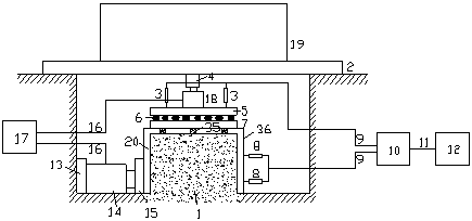 摘要:一种高填方地基现场直剪试验装置,透明保护罩(20)上从下向上依次安装下垫板(7)、滚排(6)、上垫板(5);在上垫板(5)上依次安装竖向自动加载机构(18)、传力钢柱(4)、用于承受堆载的平台钢梁(2)以及堆载(19);在透明保护罩(20)的一侧从里向外依次安装前垫板(15)、切向自动加载机构(14)、后垫板(13);自动加载控制机构(17)通过电缆(16)与切向自动加载机构(14)和竖向自动加载机构(18)相连,在透明保护罩(20)的另一侧的透明保护罩(20)上分别安装竖向位移传感器(3)和切向位移传感器(8);数据采集机构(10)通过位移传感器电缆(9)和竖向位移传感器(3)和切向位移传感器(8)相连。