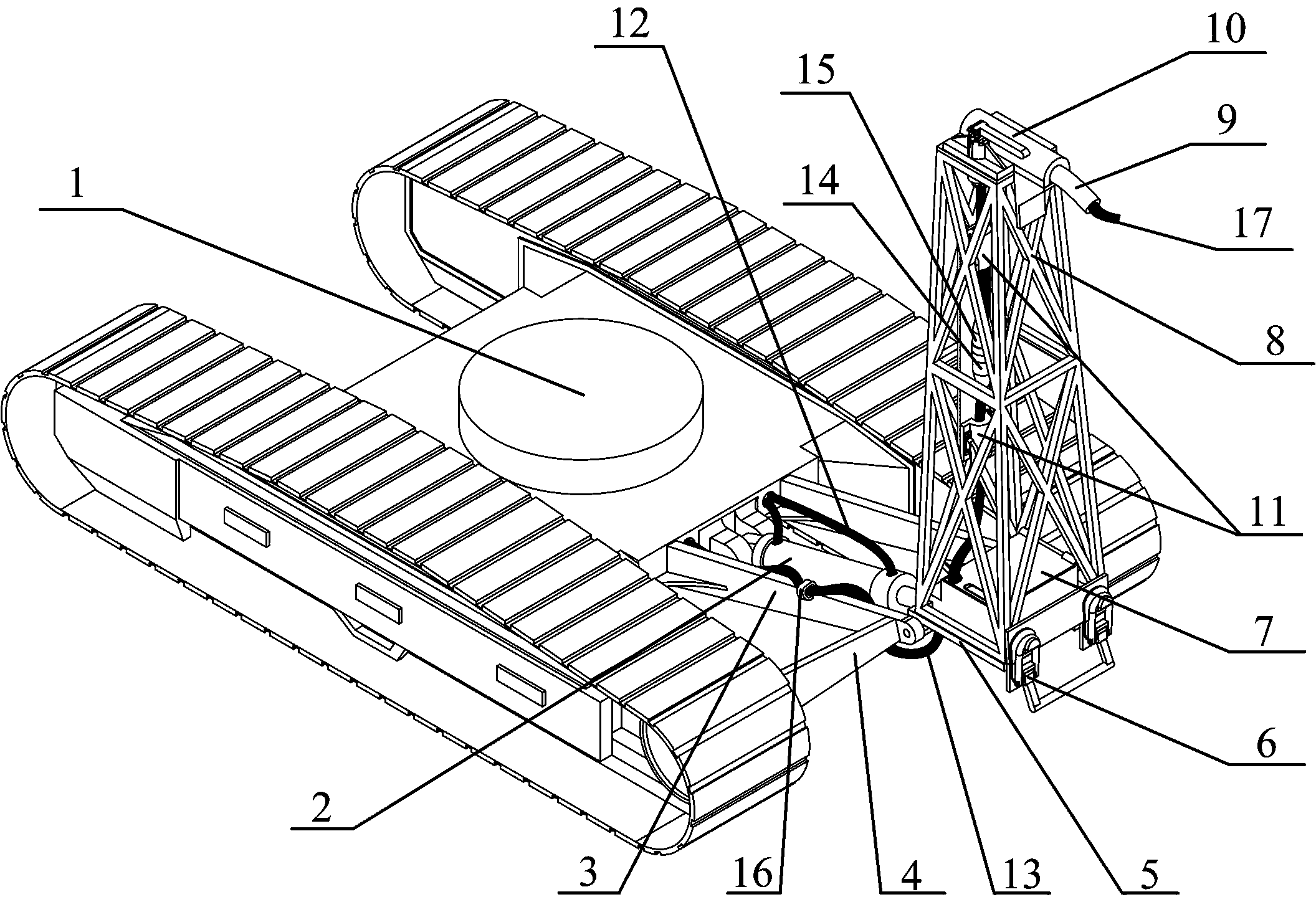 摘要:纯电动液压挖掘机专用行走架,主支撑梁(3)一端焊接于行走架(1)末端,副支撑梁(4)一端焊接于履带驱动马达端盖外侧,主支撑梁(3)与副支撑梁(4)末端连接,液压管(12)从行走架(1)末端伸出,接入液压缸(2),液压缸(2)的缸体与行走架(1)末端铰接,活塞杆与支线架底座(5)底部铰接,支线架底座(5)一端与主支撑梁(3)铰接,另一端安装支线架连接装置(6),上端安装储线箱(7),支线架(8)通过支线架连接装置(6)安装于支线架底座(5)上端,支线架(8)内部安装电缆固定夹板(11),顶部安装电缆锁紧装置(10),抗疲劳橡胶套(9)从电缆锁紧装置(10)内穿出。