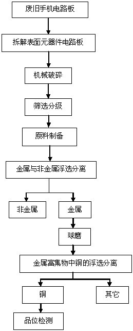 摘要:一种废旧手机电路板中铜的浮选分离方法,包括废旧手机电路板的破碎、破碎产物中金属与非金属的浮选分离、金属富集物中铜的浮选三个步骤;废旧手机电路板的破碎是将拆解表面元器件的电路板破碎至粒度0.45mm及以下,使金属与非金属完全解离;破碎产物中金属与非金属的浮选分离是将破碎产物配制成浆料,利用金属和非金属亲水性的差异,加入适量起泡剂进行反浮选,得到金属富集物;金属富集物中铜的浮选是将球磨到粒度0.15mm及以下的金属富集物配制成浆料,利用各物质在浮选药剂作用下表面性质的变化,调节影响浮选的因素如矿浆浓度、搅拌速度、充气量、药剂用量大小等因素,采用正浮选,得到铜浮选物,经过淘洗、干燥获得铜。