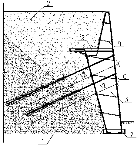 摘要:高填方边坡衡重式挡土墙与预应力锚索组合支护结构,由衡重式挡土墙(3)和预应力锚索(6)两部分组成,衡重式挡土墙(3)包括挡土墙墙身、卸载台(5)和挡墙基础(7),挡墙基础(7)埋置于卵石层或坚硬土层上,挡土墙墙身坐落于挡墙基础(7)之上,卸载台(5)位于距挡土墙墙身上口1/3~1/2并与挡土墙墙身之间有夹角,挡土墙墙身、卸载板(7)和挡墙基础(7)三者之间通过钢筋和混凝土连接浇筑为一体;预应力锚索(6)包括束线环、隔离架(20)、套管、钢绞线(14)和定位支架,预应力锚索(6)主要由多条钢绞线(14)制作,预应力锚索(6)分为锚固段(13)和自由端(12)两部分。