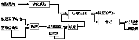 摘要:制酸尾气与废钴酸锂协同治理并回收钴锂的方法,其步骤为:将废锂离子电池进行放电、拆解获得废正极片,废正极片经焙烧、水溶解、过滤获得废钴酸锂;废钴酸锂与硫酸钾混合后球磨,球磨产物装入吸收装置;制酸尾气先经过转化操作后再通入吸收装置,吸收装置出来的符合排放标准的气体排至大气,吸收装置中的混合物取出后用水浸出,再向溶液中加入碳酸钾溶液后过滤,滤渣中补充碳酸锂后球磨、压紧、焙烧,重新获得电化学性能良好的钴酸锂正极材料。滤液经结晶处理后获得硫酸钾。