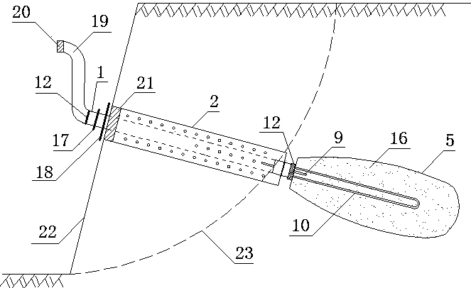 摘要:一种加速对流通风冷却锚管及施工方法,适用于多年冻土边坡,属寒区边坡支护领域。通风冷却锚管包括锚管、对流管、纤维袋、接头、抽风管和冻结系统;冻结系统由水泵、水箱、导管和盐水构成;锚管穿过定位架嵌套于对流管内,锚管后端与接头连接,卡子将纤维袋从外侧固定于接头的两个挡环之间;浆体冻结膨胀锚固于稳定地层;锚具将锚管锚固于垫片上,对流开关穿过锚管安装于对流管端部,抽风管一端安装抽风开关、另一端通过卡子与锚管连接,抽风开关和对流开关分别控制抽风管和对流管的管口封闭与张开。