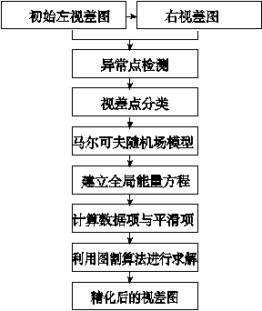 摘要:一种基于马尔可夫随机场的视差图精化方法,属于计算机视觉及模式识别技术领域,其步骤为:输入初始左视差图,得到右视差图;利用扩展的交叉验证法进行异常点的检测并将视差点进行分类;建立全局能量函数;计算数据项和平滑项;利用图割算法进行求解;得到精化后的视差图。本方法可以有效地去除局部或全局立体匹配算法生成的视差图中的误匹配点,大幅度提升视差图的精度,最终得到精化后的高精度视差图,利于视觉深度信息的进一步处理。