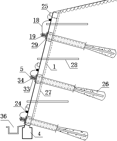 摘要:寒区主动通风冷却自恢复边坡锚固结构及施工方法,属寒区边坡支护领域。包括框架、通风锚管和通风系统,通风锚管是通过定位环在通风管内同轴嵌套锚管,在通风管外同轴套上排风管构成;通风系统由电线连接的风扇、温控开关和太阳能板构成;锚管内注入浆体传过出浆孔与周围稳定冻土粘结;在坡面施设土工格栅、排水管和框架,通风锚管穿过框架;在通风锚管前段依次套法兰垫板和弹簧,用锚具锚固在框架上;土工格栅内种植被,坡脚设排水渠;锚管前段安装风扇,框架上设置温控开关和太阳能板,并由电线连接。本发明自动送风降温效果显著,减胀减震自恢复作用明显,水分梳排及时,格栅护面及植被,促进冻土发育;方法简便易行,施工快捷。
