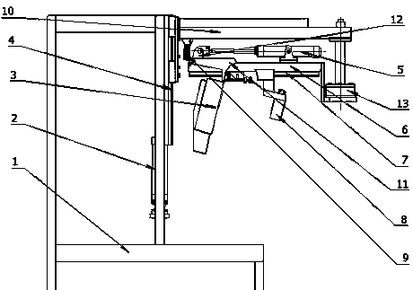摘要:铝锭激光打标专用自动定位机构,有一个固定部件机架(1)和能够相对固定部件上下和前后移动的纵向滑轨(4)、横向滑轨(7),机架下方安装有气缸(2),气缸(2)通过气缸连接头与纵向滑轨(4)上的滑块连接,纵向滑轨(4)上的滑块通过螺栓连接安装有悬臂梁(10),悬臂梁(10)与活动支架(6)后端通过弹簧(9)连接,位于活动支架(6)前端的万向接头(13)与悬臂梁(10)的前端通过轴连接,活动支架(6)上装有横向滑轨(7),横向气缸(5)安装在横向导轨(7)上,横向气缸(5)通过气缸连接头(12)与滑块连接,横向滑轨(7)上的滑块固定有固定板(11),固定板上安装有转套(8)和激光扫描头(3)。