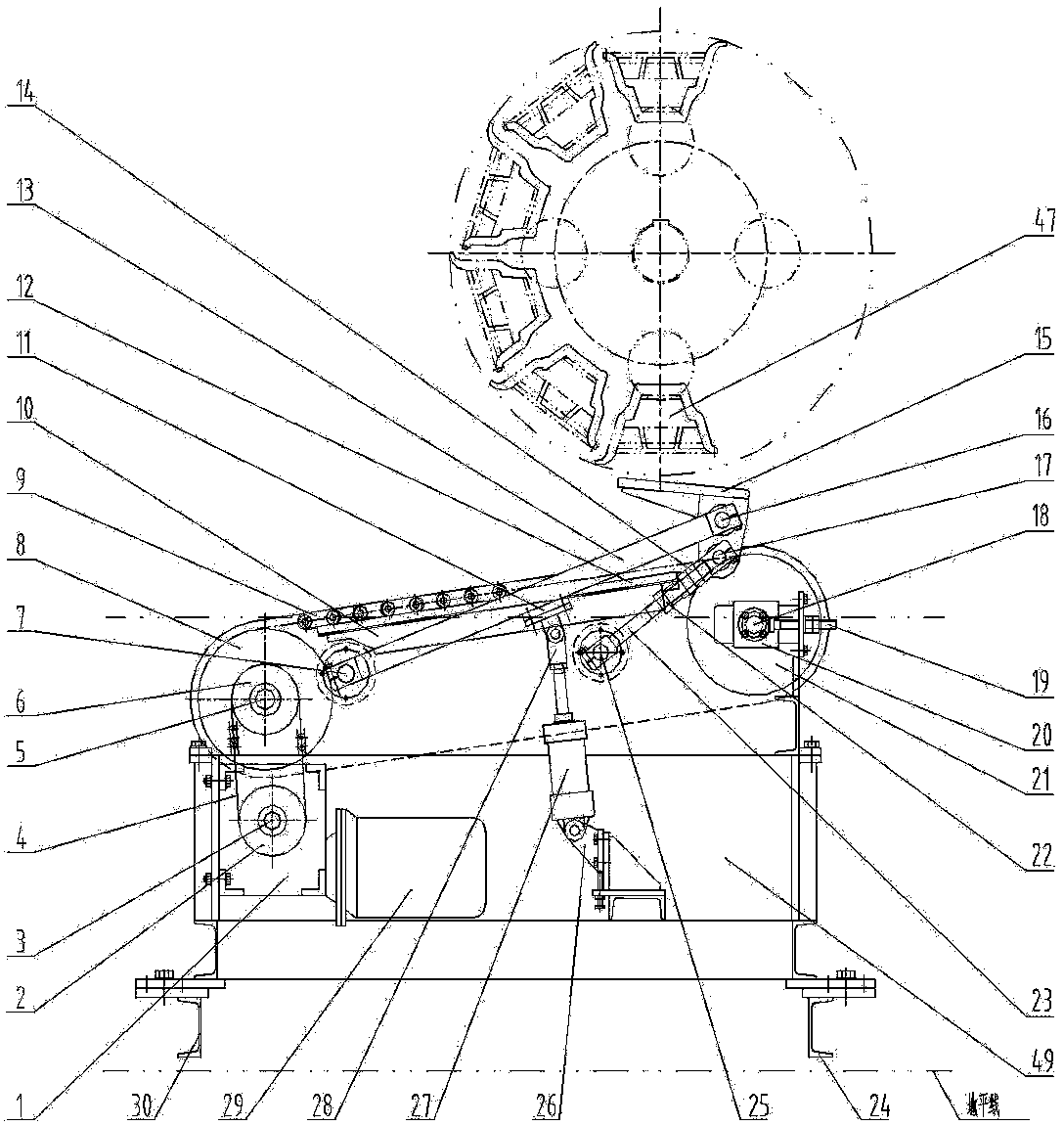 摘要:用于铝锭连续铸造生产线的链式接锭机构,双联链轮(2)固定在减速器(1)的输出轴(3)上,双联链轮(6)和主动链轮(8、31)通过键固定在轴(5)上面;轴(5)和机架(49)之间装有轴承;从动链轮(21)安装在轴(18)上,轴(18)固定在滑块(20)上,滑块(20)和机架(49)之间装有滑轨;调节螺杆(19)的一端和滑块(20)固定连接,另一端通过螺母和机架(49)连接;从动链轮(35)安装在轴(36)上,轴(36)固定在滑块(37)上,滑块(37)嵌入机架(49)内,滑块(37)和机架(49)之间装有滑轨;调节螺杆(38)的一端和滑块(37)固定连接,另一端通过螺母和机架(49)连接;链条(9)和主动链轮(8)、从动链轮(21)形成链传动,链条(33)和主动链轮(31)、从动链轮(35)形成链传动,通过轴(5)实现同步传动;机架(49)、连杆(13、32、23)和接锭爪(15)共同构成双摇杆机构,气缸(27)通过支座(26)与接锭机构的机架(49)连接。