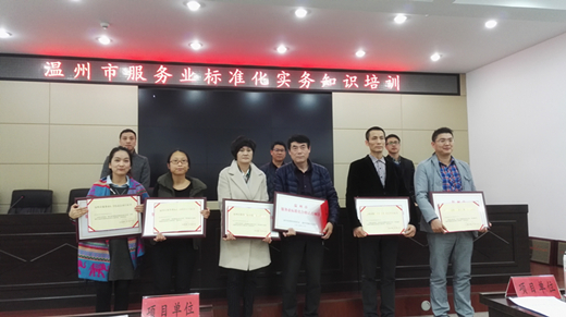 会上,为2014年和2015年度温州市级服务业标准化试点项目验收获得优秀、优良、合格的单位颁发证书和奖牌。随后,温州市发改委(服务业发展局)林健处长就自2012年温州市服务业标准化工作开展以来所获得的成绩和存在的一些问题进行了汇报,并对温州市服务业“十三五”的发展思路进行了详细的说明,指明服务业下一步的发展方向。温州市质监局周科荣处长讲解了企业做好服务业标准化工作的思路和做法,并希望企业继续重视标准化工作,利用标准化推动企业创新发展。