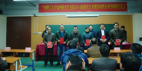 2016年1月12日,兰州理工大学温州研究生分院2014级研究生开题答辩暨企业导师聘任仪式在研究生分院举行。温州市科技局卢智远副书记、科技合作处刘焕斌处长,永嘉科技局潘宏雷局长,浙江省泵阀行业协会陈文荣秘书长,温州研究生分院杨国来院长、曹驰副院长,兰州理工大学学校导师代表、温州企业导师代表以及温州分院的全体学生参加了仪式,仪式由曹驰主持。