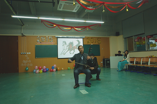 晚会在研究生们的《我们是共产主义接班人》合唱中拉开序幕,同学们以激昂高亢的歌声和饱满的热情迎接新一年的到来。随后,导师组们表演了独唱《我是一片云》、《乌苏里船歌》等歌曲,歌声悠扬动情,赢得现场阵阵掌声。二胡独奏《赛马》、《良宵》让在场观众感受到古典气息,曲子时而高昂、时而低沉,让大家体会到二胡声音的美妙。