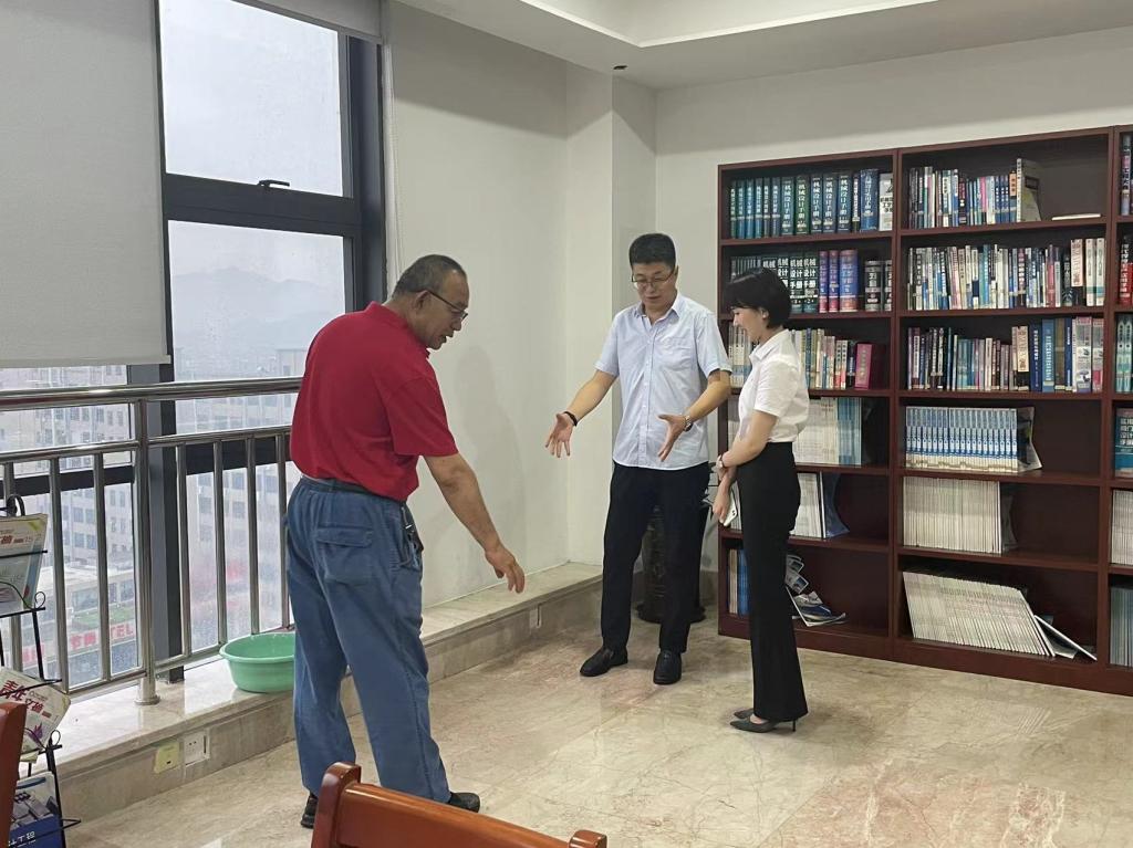 在检查学生阅览室时,发现天花板漏水问题,张伟政现场指挥积极解决。及时联系宣达集团林李迎主任来现场共同商讨解决方案,希望宣达能够及时彻底解决漏水问题。