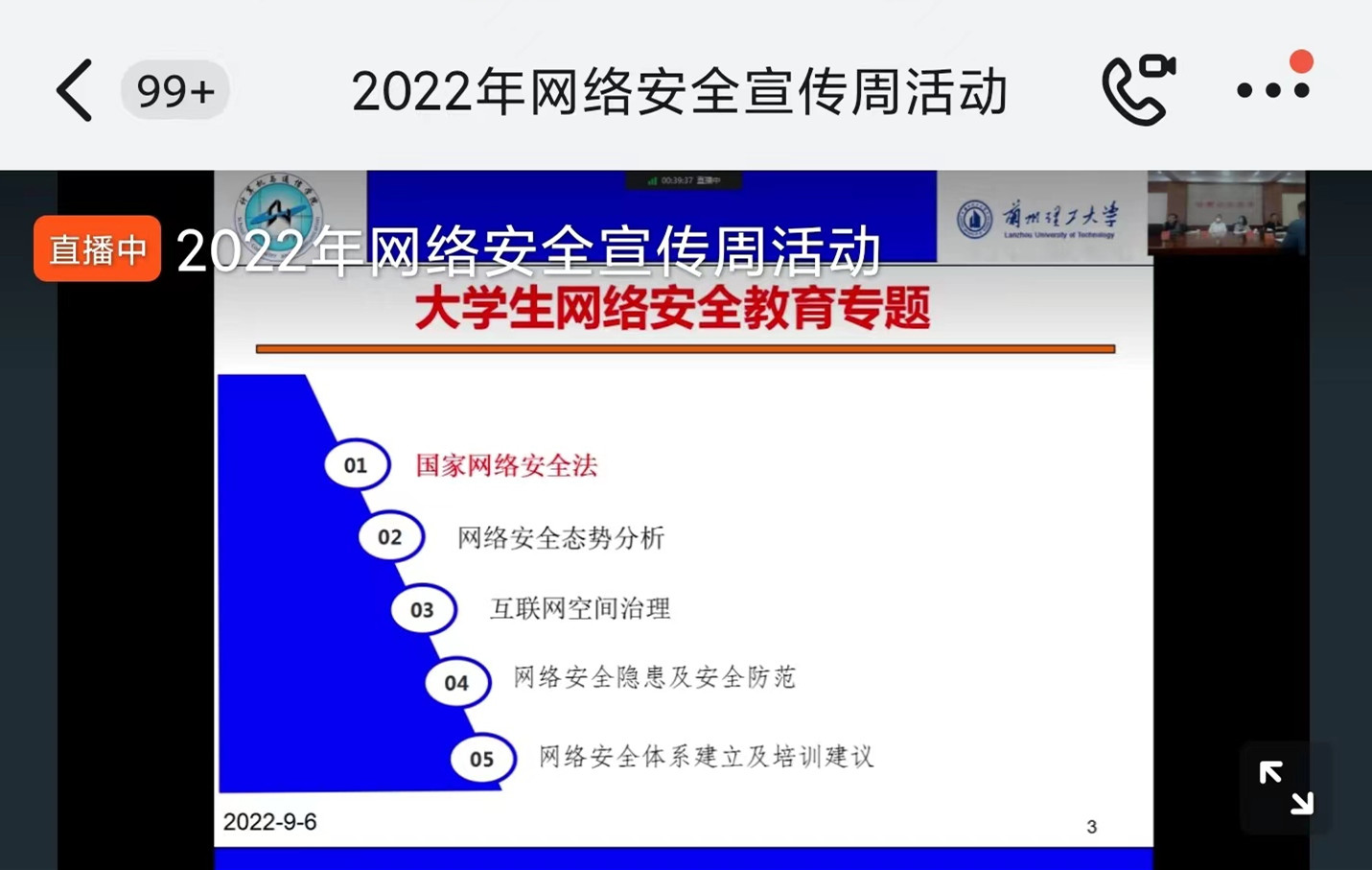 9月6日10时,研究院、研究生分院组织部分教职员工、学生参加线上校园日启动仪式。启动仪式上,活动相关负责人围绕教育系统组织开展好此次网络安全宣传周活动,共同维护网络安全、加强网络文明建设等提出具体要求、进行安排部署。兰州理工大学计算机与通信学院院长、博士生导师冯涛教授作了题为《网络安全态势与对策建议》的网络安全知识讲座。