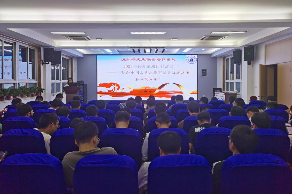温州研究生联合培养基地于2023年10月23日晚上七点半在实训楼一楼大报告厅开展2023年秋季学期迎新主题班会和“纪念中国人民志愿军抗美援朝战争胜利70周年”主题团日活动,研究生管理办老师曾文双、余可为和全体2021级、2022级来温实践研究生以线下线上方式参加。
