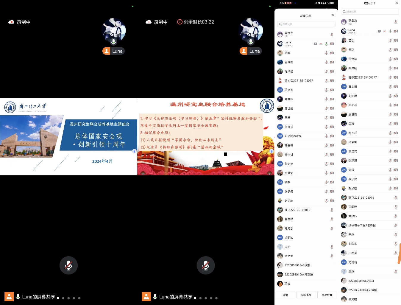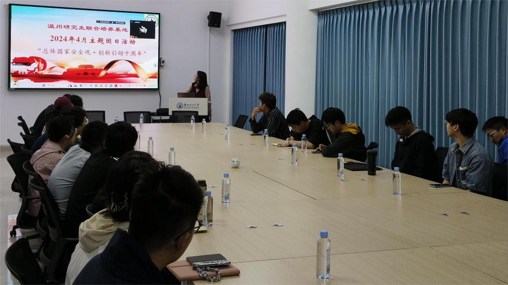2024年是习近平总书记提出总体国家安全观十周年,今年4月15日是第九个全民国家安全教育日。为了深入贯彻落实习总书记关于全面加强国家安全教育重要指示要求,进一步增强全体师生国家安全意识,深入普及国家安全知识和相关法律法规,温州研究生联合培养基地于2024年4月25日晚上七点半在基地办公楼505会议室开展“总体国家安全观点·创新引领十周年”主题班会和主题团日活动,研究生联合培养基地副院长张伟政、管理办老师、2022级来温实践研究生以线下线上方式参加。