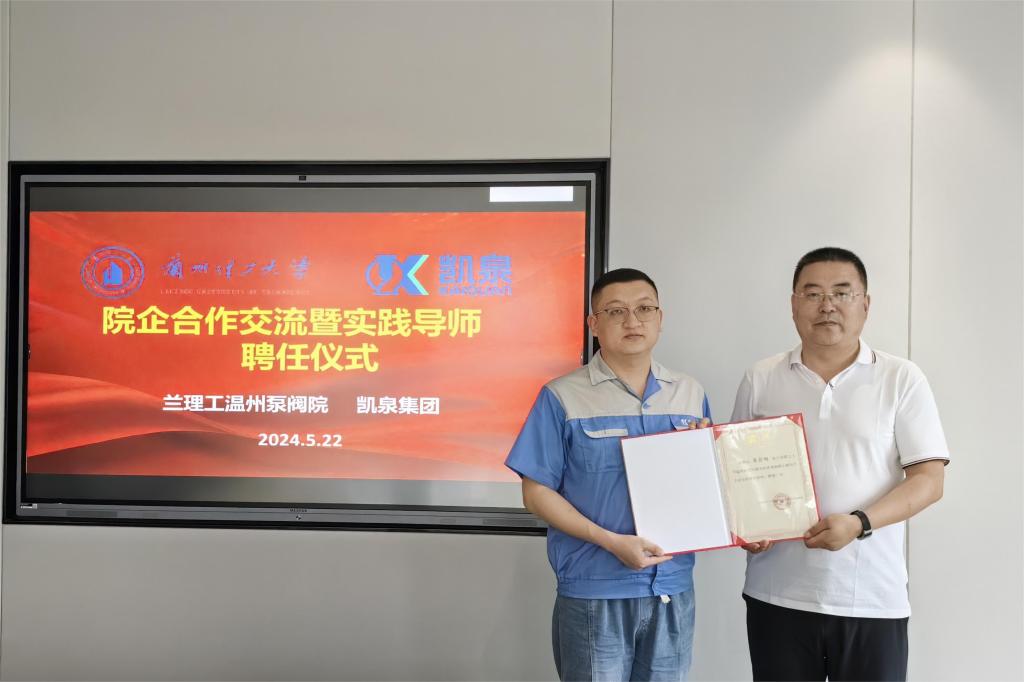 2024年5月22日下午,兰州理工大学温州泵阀工程研究院院长曹驰、副院长张伟政、专家团队赵荣珍、学校能动学院副教授王晓晖等一行人赴凯泉集团有限公司,与公司总经理黄卫宁、工程部经理李金旭、派驻公司的研究生开展座谈交流,并颁发企业导师聘书。