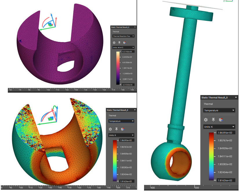 在高温环境下,球阀因球体表面温度高于内部介质温度、阀体外壁温度低于内壁温度而形成非均匀温度场,进而引发热膨胀。同时,受限于部件间的装配关系,结构内部将产生相应的热应力。这种温度场与应力场的相互耦合是导致高温球阀失效的主要机制之一。基于热传导方程与结构力学方程,利用有限元法可系统模拟球阀的温度分布及热应力变化规律,定量评估热力耦合对其抗力性能的影响。通过分析结果,可准确定位球体在高温状态下的应力集中区域,并据此对球体壁厚进行针对性优化或合理设置冷却结构,从而提升球阀在高温工况下长期运行的可靠性。球体与阀杆的有限元分析结果见图2。