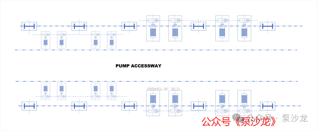 在多数化工厂和石化厂中,泵通常布置在管廊下方或邻近管廊的位置,便于管道连接和介质输送。在条件允许时,泵的布置应使其驱动端朝向检修通道,以便于对泵驱动机进行维护。为保持现场布置整体美观性和规范性,通常会将泵的出口中心线对齐。推荐的检修或操作通道宽度为2至2.5米,以确保移动式检修设备(如叉车、检修平台)能够通过该通道接近泵。泵的布置还应为经常需要维护和找正的填料密封、机械密封及联轴器提供良好的操作空间。这就要求管道布置应确保泵及驱动机的至少一侧留有足够的操作通道。此外,某些泵可能配有尺寸较大的密封油橇,其安装空间需提前规划,避免影响泵与泵之间的间距,确保检修作业不受阻碍。