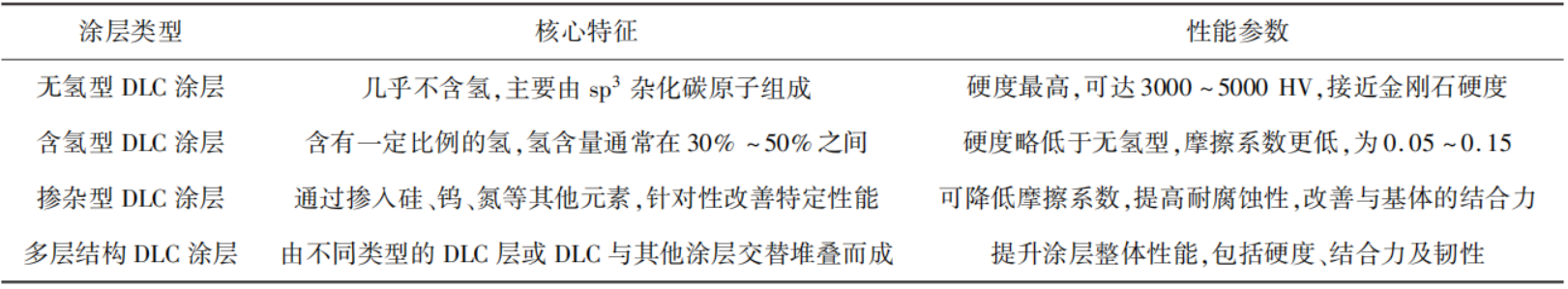 根据结构和成分的不同,DLC涂层可分为多种类型,如表1所示。不同类型的DLC涂层具有不同的性能特点,适用于不同的应用环境。例如,无氢型DLC涂层硬度最高,适合要求极高耐磨性的场合;而含氢型DLC涂层摩擦系数更低,适合需要减小摩擦的应用场景;掺杂型DLC涂层则可根据具体需求定制性能;多层结构DLC涂层可同时满足高耐磨与强结合力的要求,适合对综合性能有要求的场景。